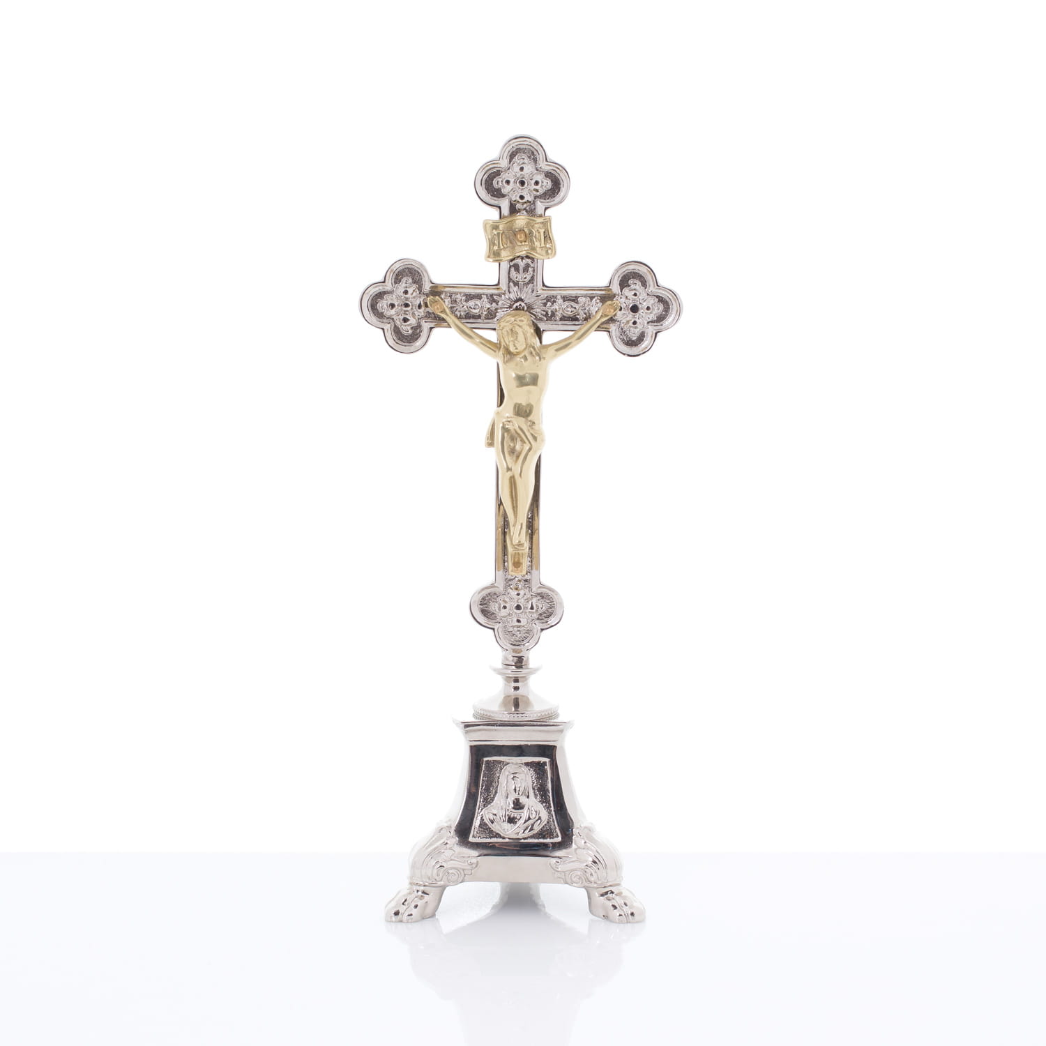 Pięknie zdobiony mosiężny krzyż, niklowany. Nie wymaga konserwacji. Do postawienia na ołtarzu lub kaplicy.