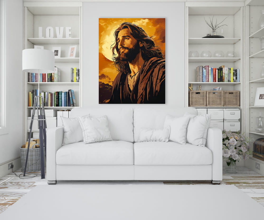 Das Gemälde des Herrn Jesus vor dem Hintergrund der untergehenden Sonne ist in goldbraunen Farben gehalten, die eine Atmosphäre von Wärme und Eleganz in Ihr Zuhause bringen. Dadurch wird das Gemälde zu einer schönen Dekoration für jedes Interieur, unabhängig von dessen Stil.