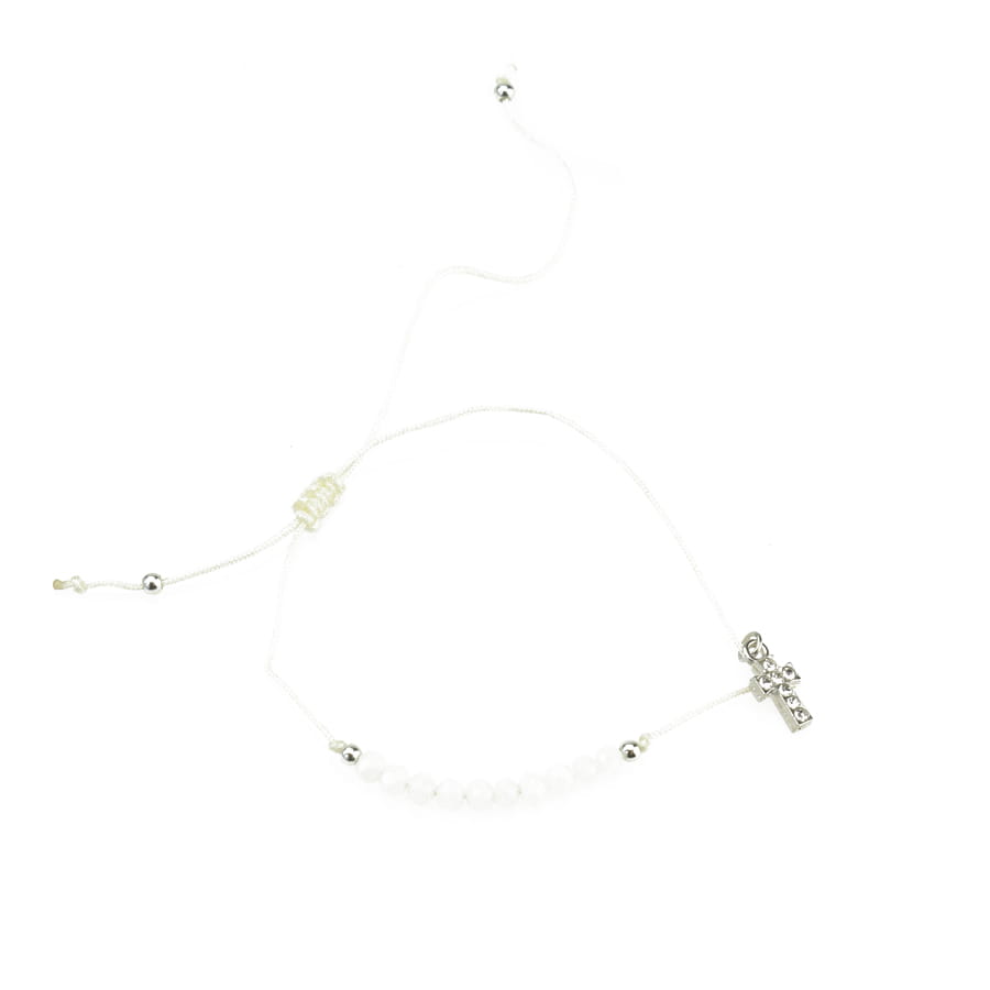 Bransoletka religijna na rękę wykonana z koralików w kolorze białym połączonych sznurkiem poliestrowym. Rozmiar uniwersalny z łączeniem w postaci krzyża. Regulacja za pomocą węzła przesuwnego.