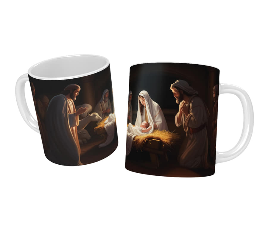 Hochwertiger Keramikbecher mit Heiliger Familie und Weihnachtsgrüßen, spülmaschinenfest mit haltbarem Druck und lichtechten Farben.