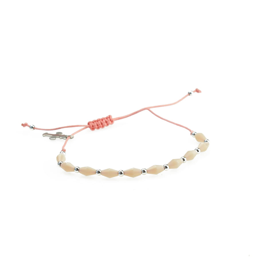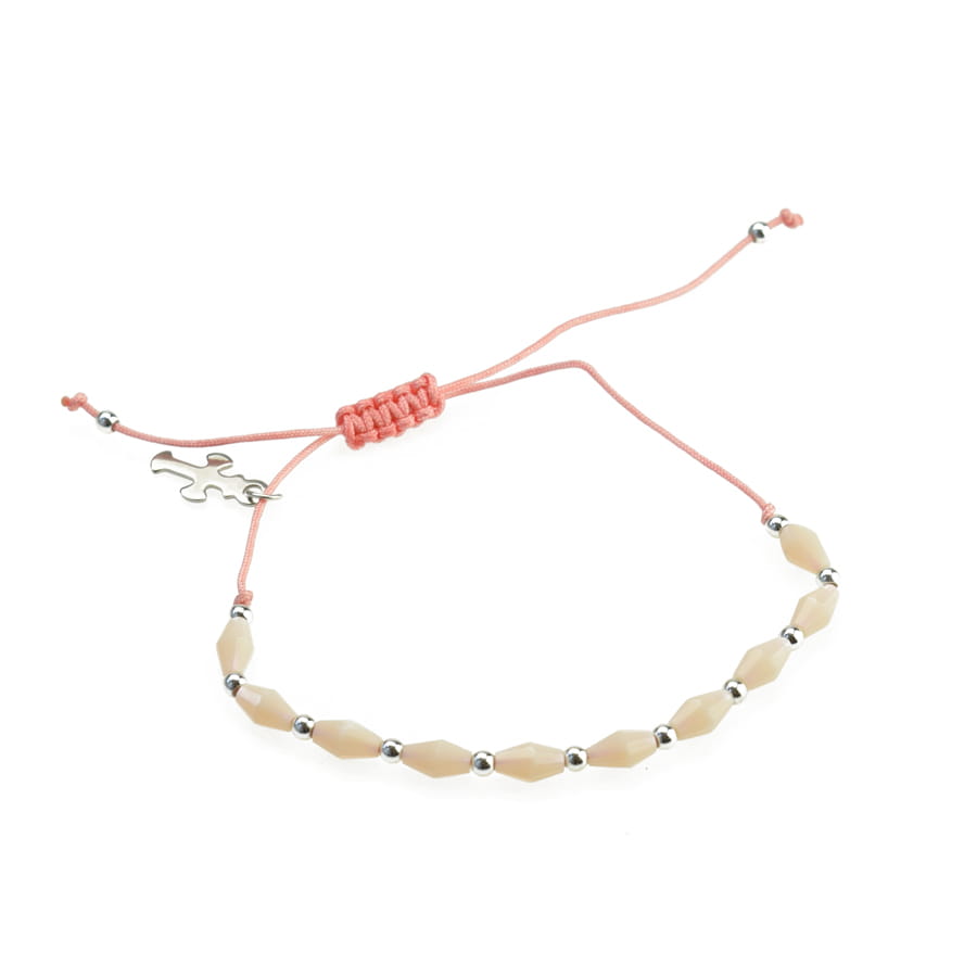 Bransoletka religijna na rękę wykonana z podłużnych koralików w kolorze pudrowego różu połączonych sznurkiem poliestrowym. Rozmiar uniwersalny z zawieszką w postaci krzyża. Regulacja za pomocą węzła przesuwnego.