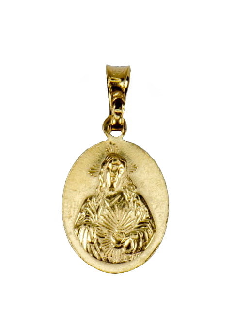 A double-sided gold-plated medal with the image of Our Lady of Perpetual Help on the front and the Heart of Jesus on the back. Oval gold-plated silver pendant for a gold or gilded chain.