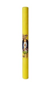 A tall paraffin candle decorated with a sticker with the image of Our Lady of the Candle. A large paraffin Candlemass Candle.