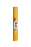 A small wax candle with a sticker with the image of Our Lady of Fatima. A candle made of paraffin with an admixture of beeswax.