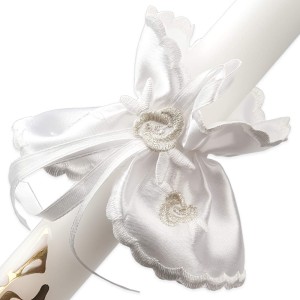 Ozdoba na świecę tzw. profitka wykonana z materiału atłasowego z haftowanymi białymi aplikacjami. Posiada wszytą gumkę dzięki której profitka dopasuje się do świecy.