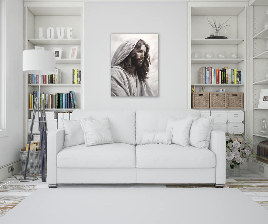 Erhältlich in vier verschiedenen Größen, kann dieses Porträt von Jesus mit Kopftuch sowohl in kleinen, intimen Räumen als auch in großzügigen Wohnzimmern seinen Platz finden. Es liegt an Ihnen zu entscheiden, welche Größe die spirituelle Inspiration in Ihrem Zuhause einnehmen soll.