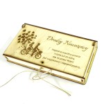 Pudełko na upominek ślubny wykonane ze sklejki z laserowym nadrukiem - para jadącą na rowerze i napisem "Drodzy Nowożeńcy. Niejedną wspólną podróż macie już za sobą, ale ta przed Wami jest wyjątkowa i niepowtarzalna". Zamykane pudełko na prezent dla Pary Młodej. Do środka można włożyć gotówkę lub drobny upominek. Pudełko przewiązywane sznureczkiem.