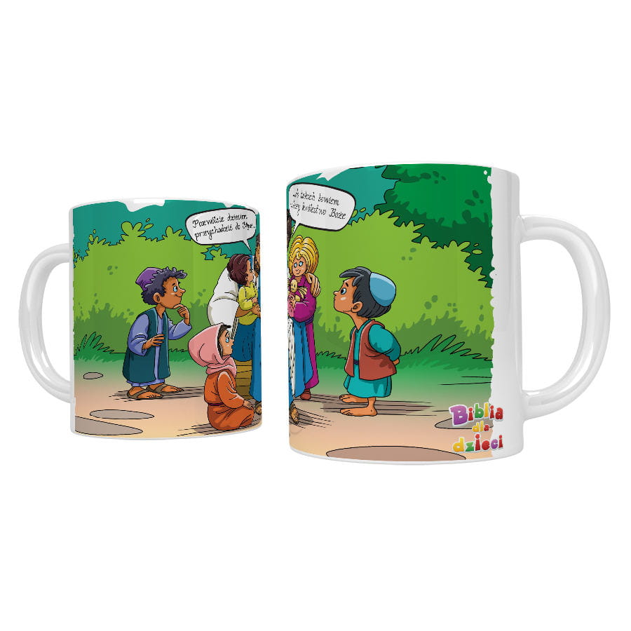 Tasse für Kinder im Vorschul- und frühen Schulalter. Tassen mit biblischen Motiven in einer zugänglichen Cartoon-Form mit Comic-Elementen sind ein großartiger Teil der Kindererziehung und helfen ihnen, die wichtigsten Szenen zu verstehen, die in der Heiligen Schrift erzählt werden. Das Produkt ist besonders empfehlenswert für Kindergärten und Katecheten, Kirchengemeinden, die Aktivitäten für Kinder organisieren, aber auch für Eltern, die sich um die richtige spirituelle Entwicklung ihrer Kinder kümmern.