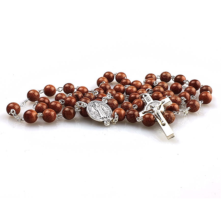 Przepiękny różaniec z półszlachetnego kamienia Piasek pustyni, wykonany na łańcuszku. Jest to elegancka wersja różańca z łącznikiem – medalem św. Benedykta i benedyktyńskim krzyżem dedykowana osobom, które chcą strzec swojego życia duchowego i cielesnego za pomocą modlitwy-egzorcyzmu znajdującego się na medaliku: