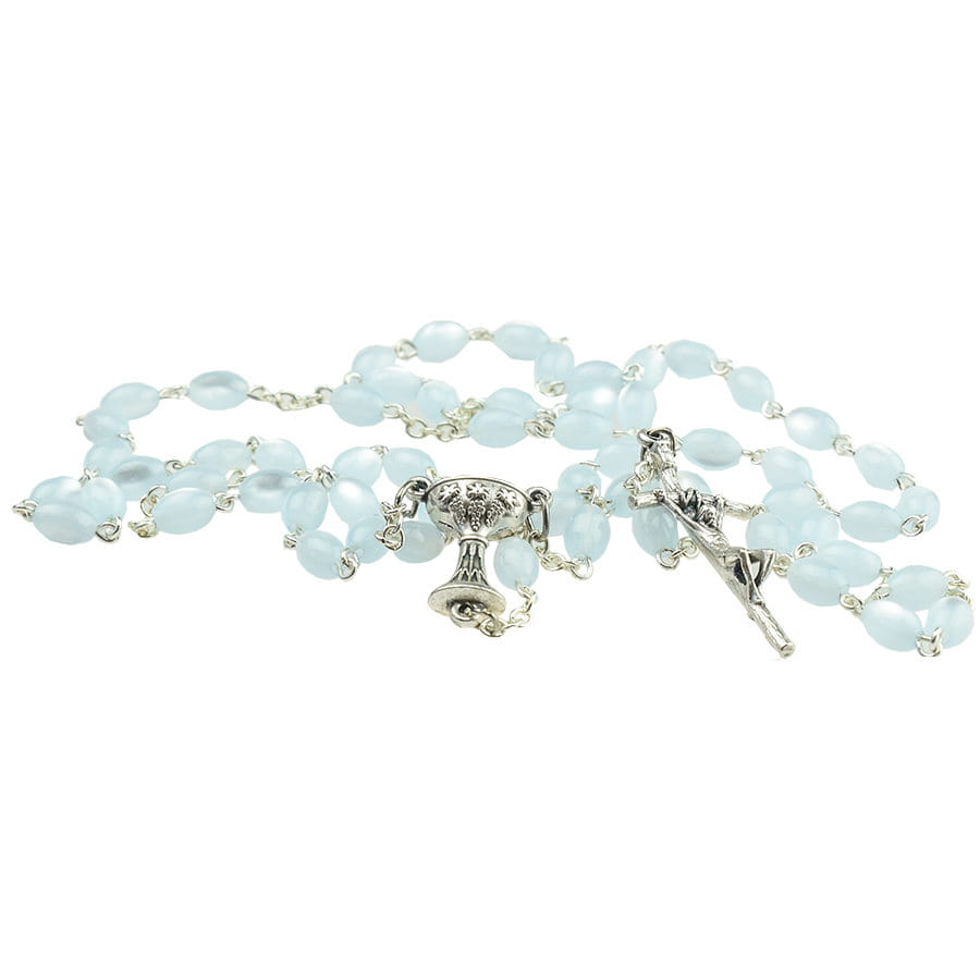 Różaniec szklany o wyjątkowo pięknym wyglądzie wykonany z półprzezroczystych koralików w kolorze niebieskim. Idealny na Pierwszą Komunię dla chłopca. Paciorki posiadają owalny kształt pasujący do dziecięcej dłoni. Całość została zwieńczona krzyżem papieskim. Lekki różaniec na łańcuszku z łącznikiem w postaci kielicha z Hostią to szczególny prezent komunijny zapraszający najmłodszych wiernych do modlitwy.