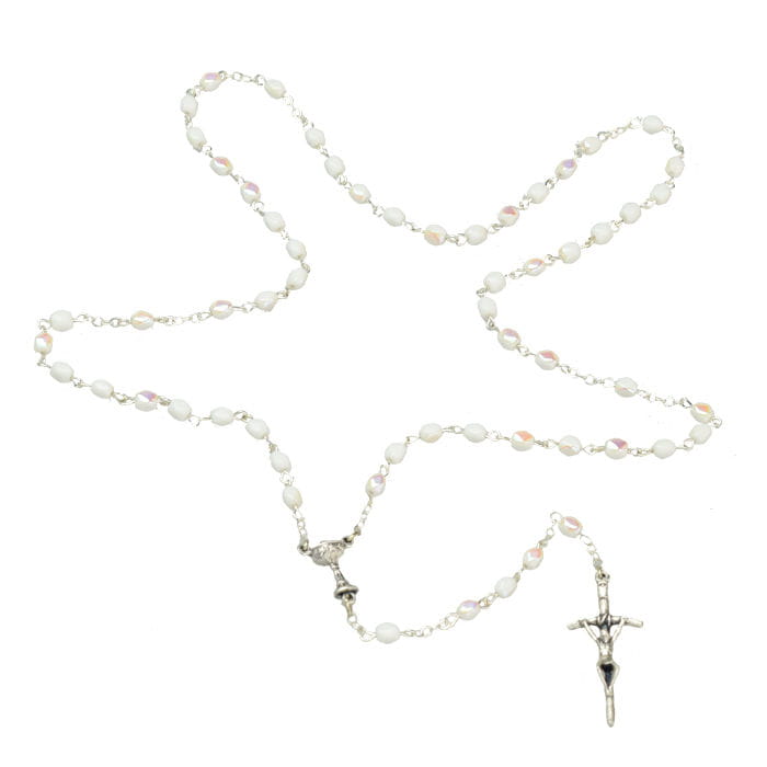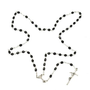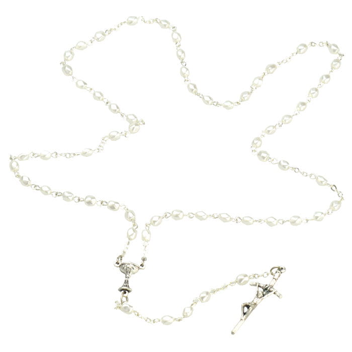 Różaniec na Komunię Świętą. Elegancki różaniec na Pierwszą Komunię został wykonany na solidnym metalowym łańcuszku. Jest lekki i wygodny w użytkowaniu – koraliki w czarnym, białym i białym opalizującym kolorze, połączony kielichem z Hostią. Zwieńczeniem wzoru jest elegancki krzyżyk papieski.