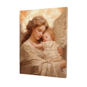 Tauchen Sie ein in eine Atmosphäre der spirituellen Fürsorge und Liebe mit unserem Leinwandgemälde, das einen Schutzengel darstellt, der ein Kind in seinen Armen hält. Dieses nostalgische Gemälde voller Wärme und Pastellfarben ist nicht nur eine schöne Dekoration, sondern auch ein Ausdruck spiritueller Werte und Ästhetik.
