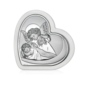 This silver heart-shaped plaque featuring a Guardian Angel watching over a sleeping child is a special symbol of protection and blessing. It is a perfect gift for a baptism, birth of a child, or other significant religious events.