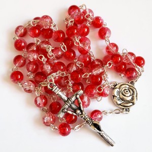 Elegancki, czerwony różaniec wykonany ze szklanych koralików. Łącznik z symbolem Maryi -różą, zakończony krzyżykiem papieskim.