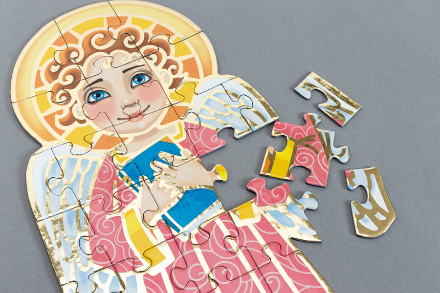 - Puzzle z postacią Anioła Stróża: 30-elementowe puzzle, ozdobione złotymi akcentami, przedstawiają postać Anioła Stróża. Dzięki nim, dzieci mogą nie tylko doskonalić swoje zdolności manualne, ale również zetknąć się z ważnym elementem wiary chrześcijańskiej.