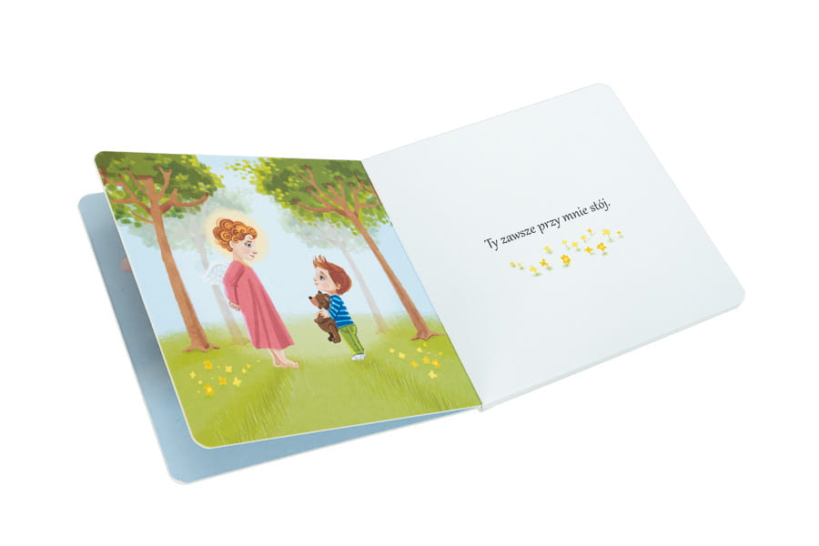 - Książeczka z modlitwą: Kartonowa książeczka zawiera tradycyjną modlitwę "Aniele Boży", dzięki której dzieci od najmłodszych lat mogą się zwracać do swojego opiekuna z prośbą o ochronę i wsparcie.