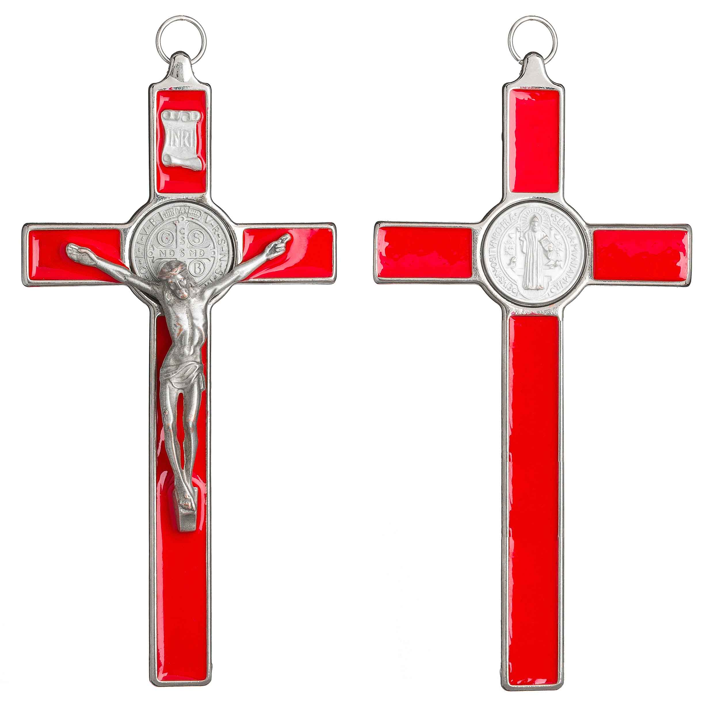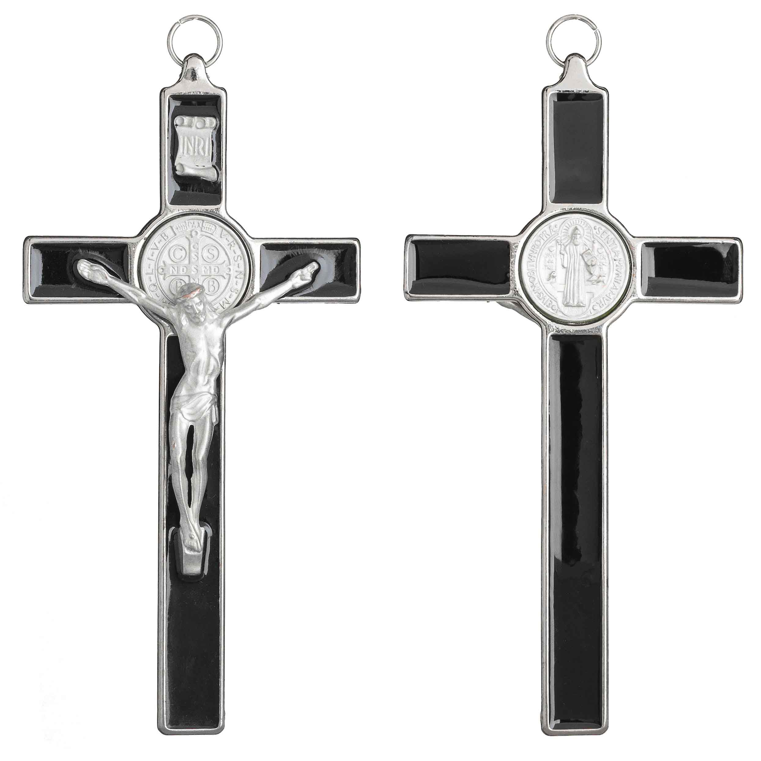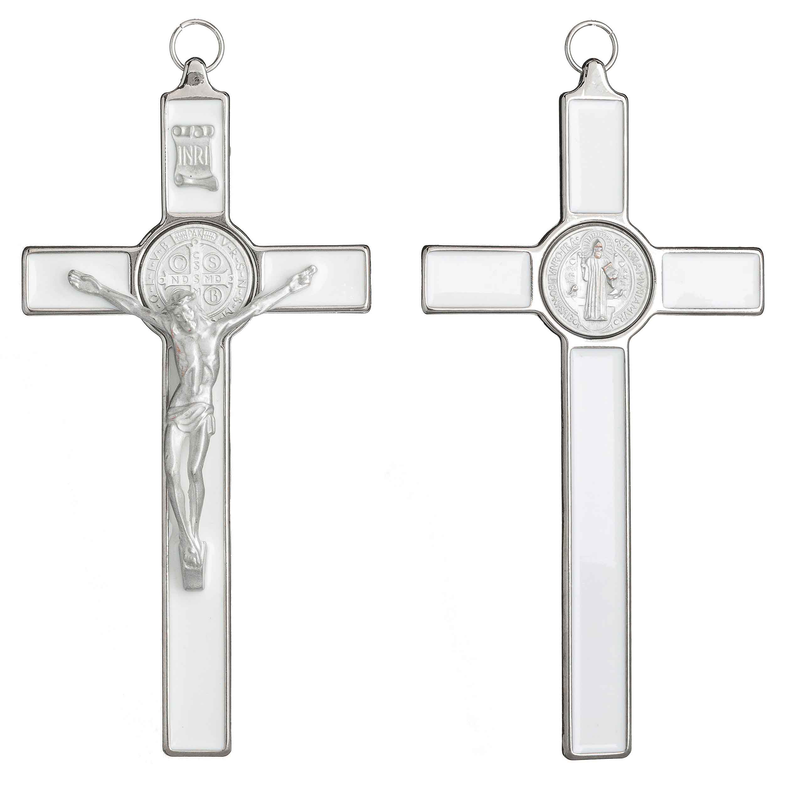 Metalowy krzyż w kolorze srebrnym z wypełnieniem z kolorowej emalii. Krzyż wiszący z medalem świętego Benedykta przedstawiającym wizerunek świętego Benedykta i pierwsze litery modlitwy egzorcyzmu na odwrocie.