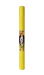 A yellow thunder candle decorated with a sticker with the image of Our Lady of the Candle. A tall yellow Candlemass Candle.